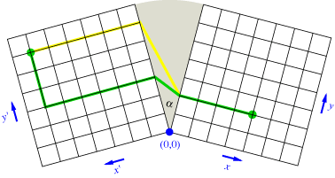 Let the point in the (x’,y’) lattice be at (X’,Y’) and let the point in the (x,y) lattice be (X,Y). Any path from (X’,Y’) to (X,Y) has three segments: