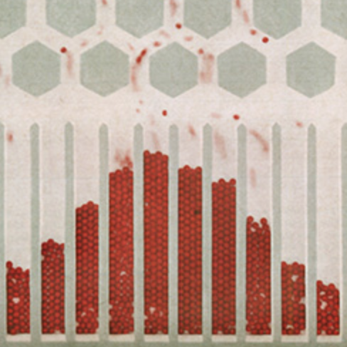 Each of the slender bars that grow from the baseline of the chart represents a single Zip-code, from all-gray at the far left, through all-gold in the middle, and on to all-green at the extreme right. The coloring of the bars interpolates between gray, gold, and green, based on the number of tiles with the corresponding color, but ignoring the position of those tiles within the word. Thus codes such as